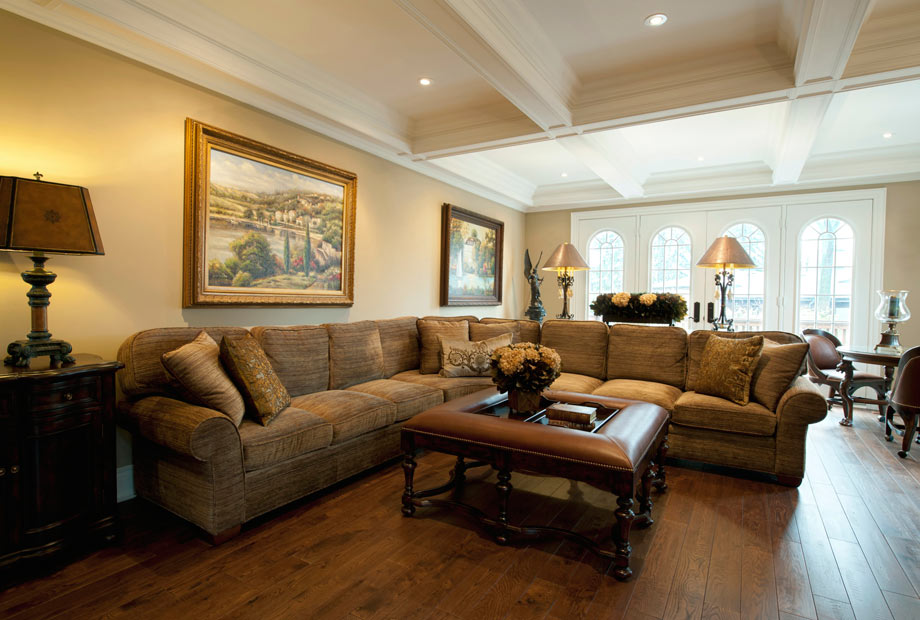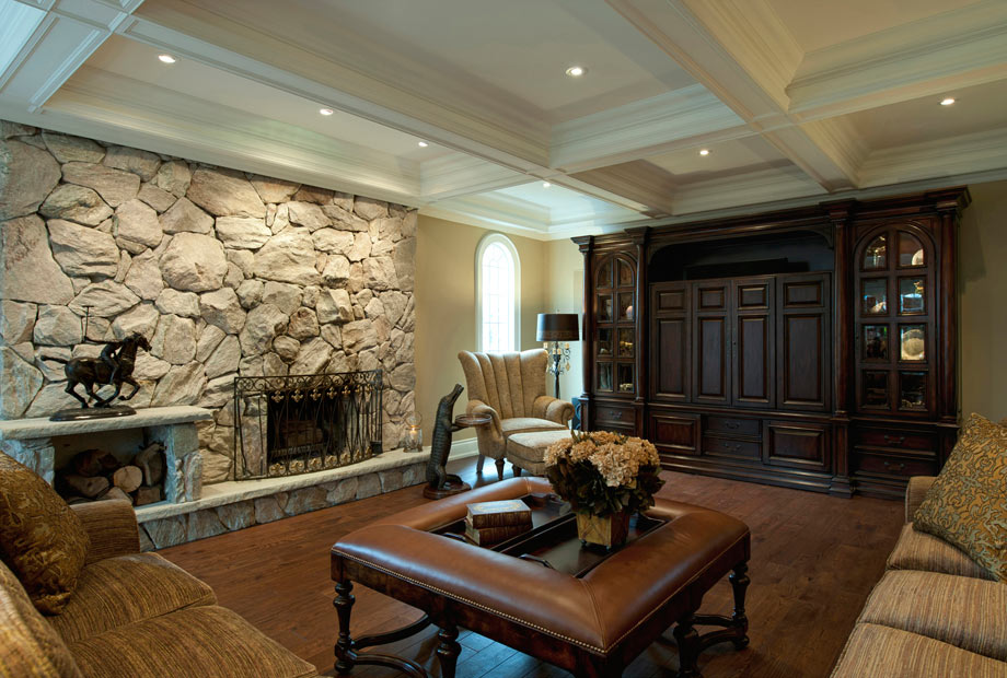 The effect of the distinctive coffered ceiling subdues the impact of the natural stone fireplace. The Entertainment Unit provides function and balances the visual weight of the fireplace.