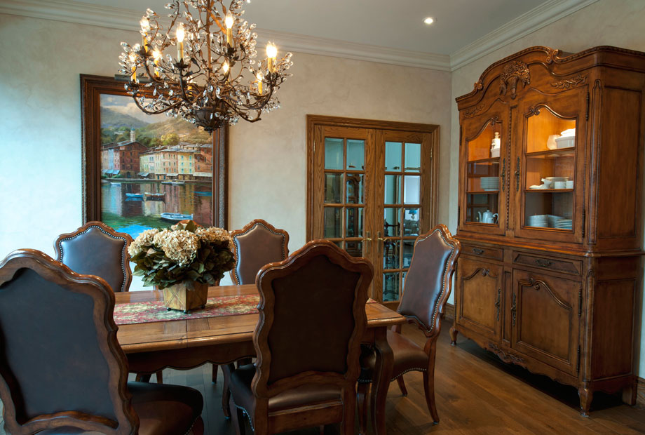 Design Wisdom: The design transformation echoes estate grandeur yet maintains an approachable, comfortable, timeless elegance. The French Doors were removed from the picture wall to create a more homogeneous look and feel to the space.
