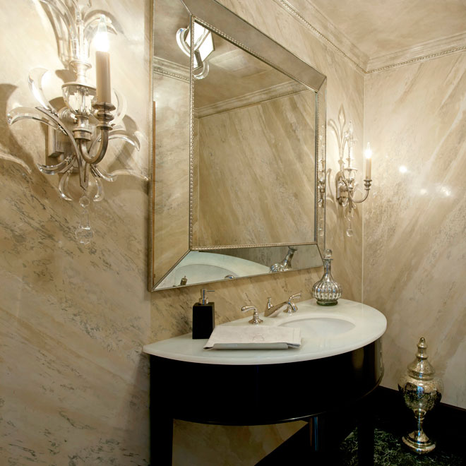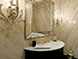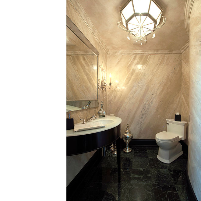 The authentic, unparalleled venetian marble technique on the walls completes the jewel-like appeal of the Powder Room.