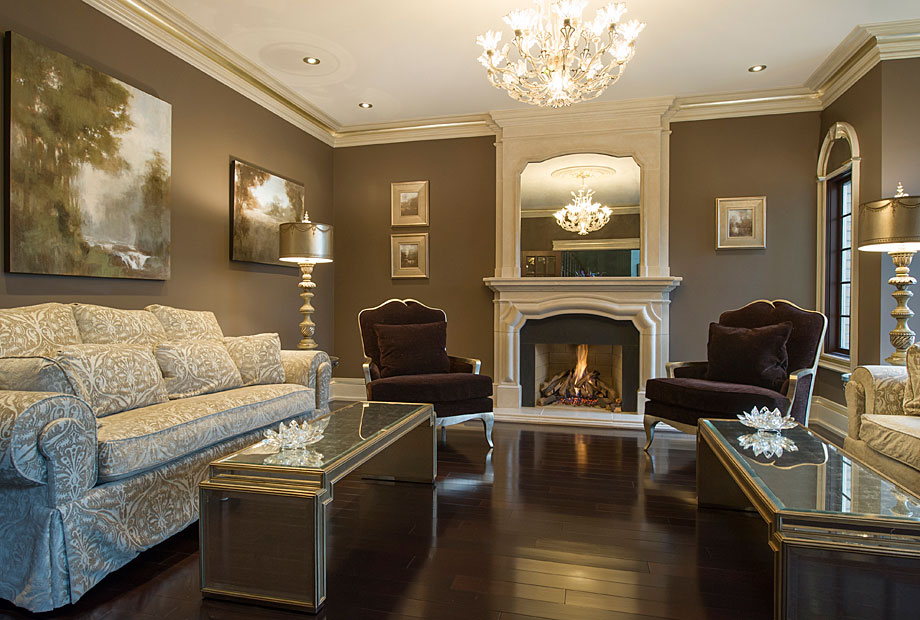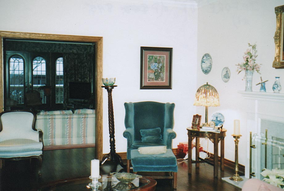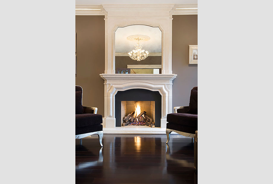 These images illustrate the dramatic transformation the fireplace underwent. Note the repetition of the curved pattern in the fireplace opening, the overmantle mirror and the framework of the upholstered accent chairs. The dazzling crystal chandelier reflects beautifully in the overmantle mirror.