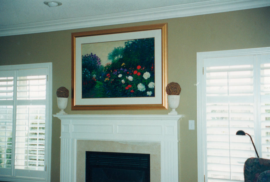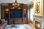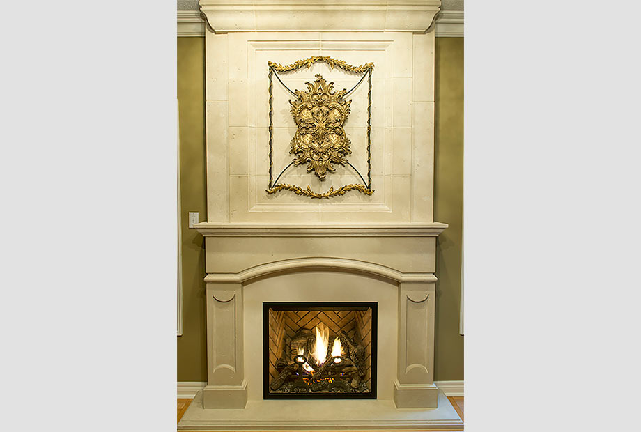 The custom designed fireplace creates a dramatic focal point and the impressive overmantle was patterned to accommodate the iron grill work piece.